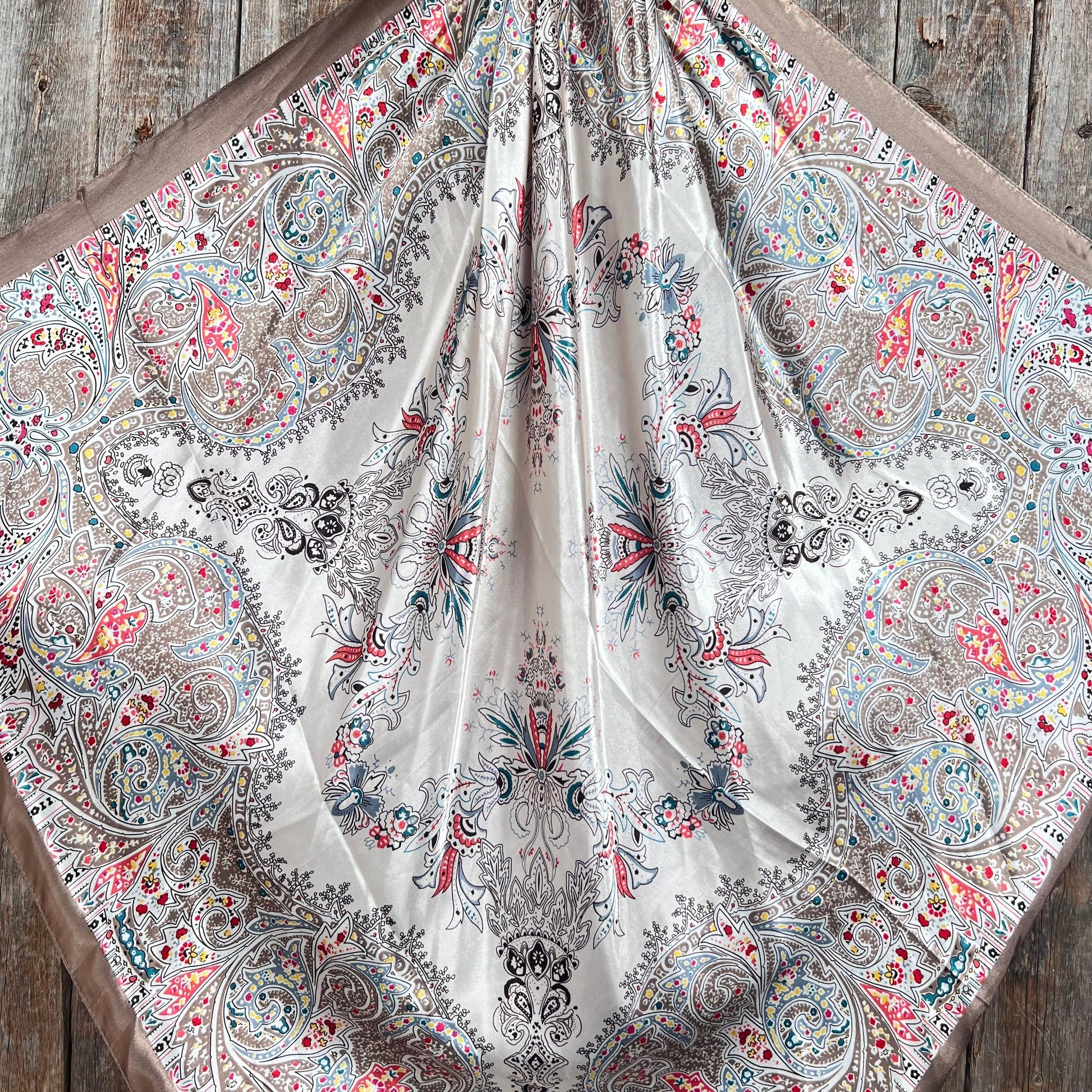 Our classic wild rag/scarf in a neutral tan with a decorative floral pattern with rust and burnt orange highlights. Measures 35" x 35". It is sure to add a bright pop of color to any outfit. 100% machine washable polyester, silky and soft.