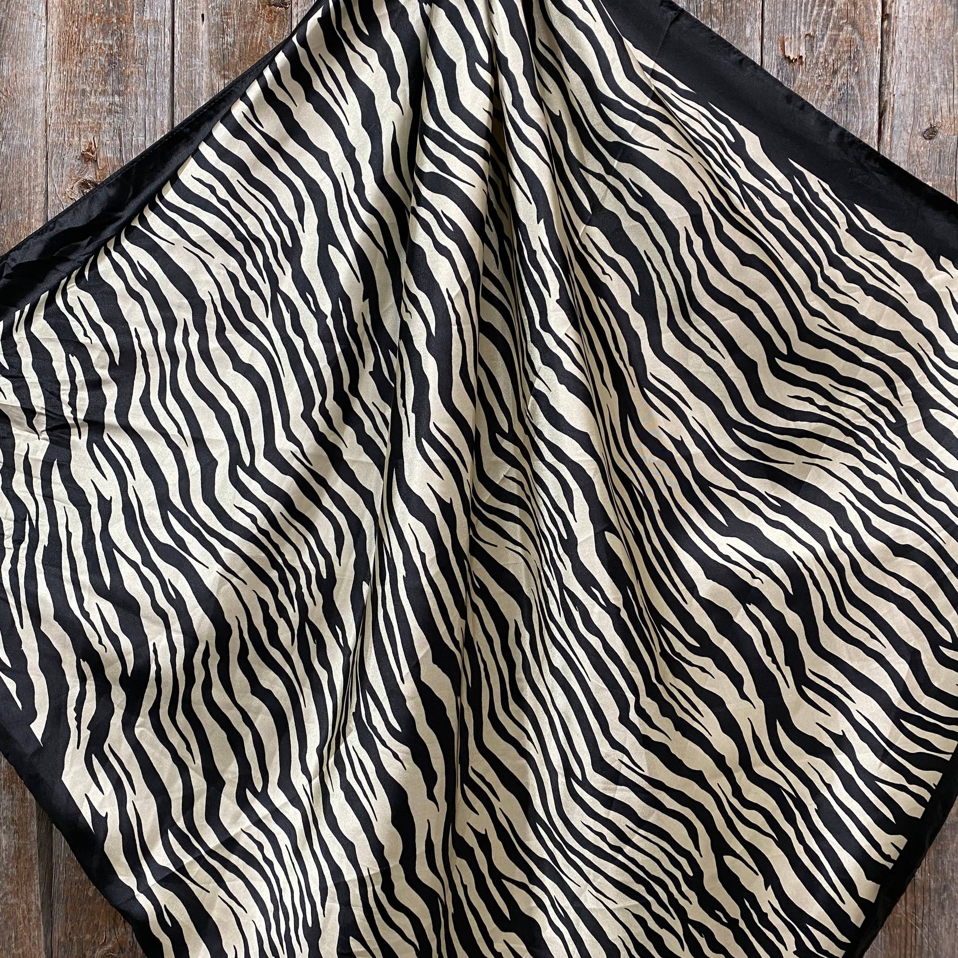 Our classic wild rag is bold & beautiful trimmed in black with a tan zebra stripes pattern. It is a square and measures 35" x 35". It will surely add a bright pop of color to any outfit—100% machine washable polyester, silky and soft.